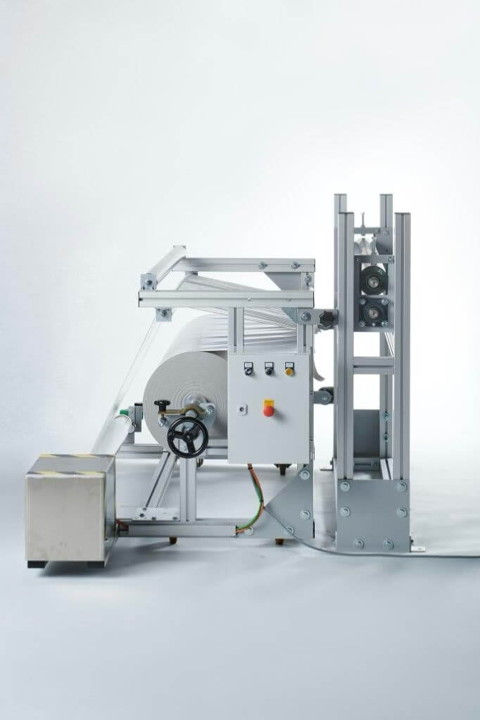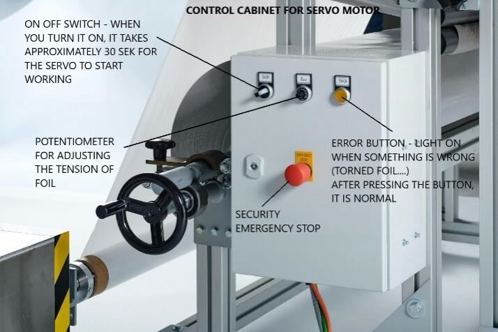 Winding the foil with a servo motor enables controlled separation of the foil from the fleece. By adjusting the tension of the foil unwinding on the servo motor, we enable higher quality winding. Adjustable foil winding tension enables higher quality winding with different types of anti-condensation fleece. electrical cabinet with servo motor control cabinet with stepless film tension adjustment additional unidirectional rotating rollers for separating the film and fleece. shaft for quick roll of foil replacement