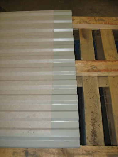 The space without fleece can be programmatically adjusted from 6 cm to 30 cm or more, as desired. The profiling line must be stopped twice. Once for cutting and gluing the fleece to the sheet metal and once for cutting the sheet metal to the predetermined panel length.